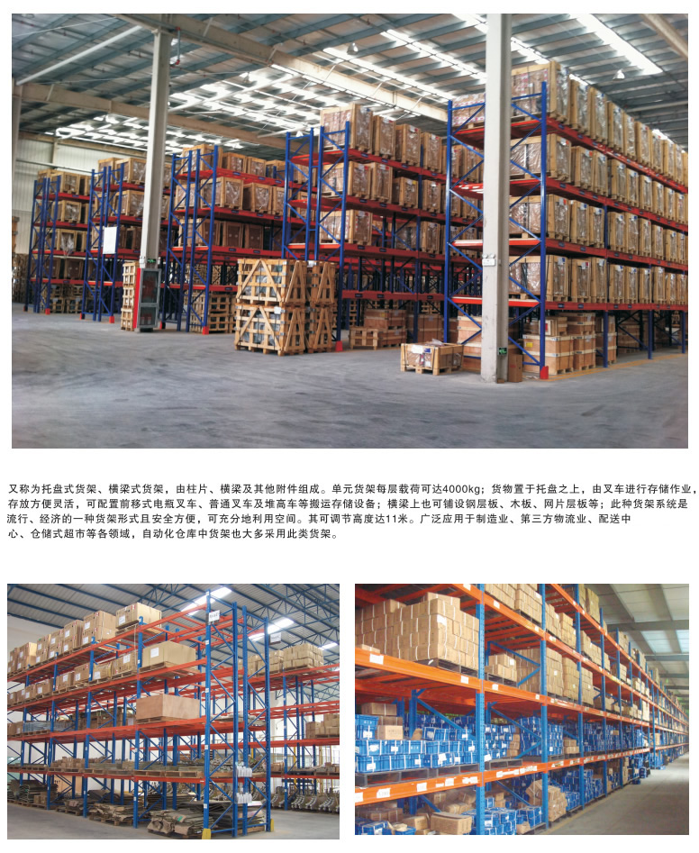 | 重型貨架,又俗稱橫梁式貨架,或稱貨位式貨架,屬于托盤貨架類,在國內(nèi)的各種倉儲貨架系統(tǒng)中較為常見一種貨架形式。以立柱片+橫梁形式的全組裝結(jié)構(gòu),結(jié)構(gòu)簡明有效。可根據(jù)存儲單元集裝設(shè)備的特性加裝如:隔檔、鋼層板(木層板)、金屬絲網(wǎng)層、倉儲籠導(dǎo)軌、油桶架等功能性附件。滿足不同單元集裝設(shè)備形式的貨物存儲。 重型貨架主要特征 ■通常貨物通過托盤、倉儲籠等單元集裝設(shè)備整裝后存入貨架保管。每單元載重一般在2000kg以內(nèi),每層通常放兩個單元。 ■是較普遍和廣泛使用的貨架之一,適合絕大多數(shù)倉庫或產(chǎn)品貨物使用。 ■具有100%的貨物任意揀選特性。搬運(yùn)機(jī)械如叉車等可到達(dá)任意貨位進(jìn)行存儲作業(yè),存儲作業(yè)方便、快捷! ■以機(jī)械搬運(yùn)設(shè)備進(jìn)行存儲作業(yè)。 ■單元貨架跨度一般在4m以內(nèi),深度在1.5m以內(nèi),低、高位倉庫貨架高度一般在12m以內(nèi),超高位倉庫貨架高度一般在30m以內(nèi)(此類倉庫基本均為自動化倉庫,貨架總高由若干段12m以內(nèi)立柱構(gòu)成)。 ■能夠以75mm的整數(shù)倍自由調(diào)節(jié)每層層高。 重型(橫梁式)貨架一般采用冷軋異型鋼制作,立柱由80(90)x60(70)Ω型鋼表面沖菱形孔而成,橫梁由80x50-100x50-120x50-140x50-160x50抱焊梁連接掛件而成,一般用托盤代替層板方便叉車搬運(yùn)。層載重1噸到5噸的設(shè)計(jì),表面靜電噴塑,防水防銹防腐蝕能力更強(qiáng),安全系數(shù)高,插接式組合,不需要用螺絲和焊接,組裝非常方便,充分利用空間面積,提供倉儲能力。 |
