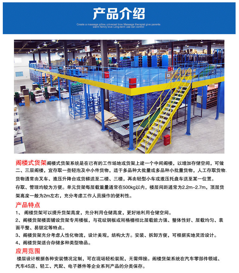 閣樓式貨架系統是在已有的工作場地或貨架上建一個中間閣樓,以增加存儲空間,可做二、三層閣樓,宜存取一些輕泡及中小件貨物,適于多品種大批量或多品種小批量貨物,人工存取貨物.貨物通常由叉車、液壓升降臺或貨梯送至二樓、三樓,再由輕型小車或液壓托盤車送至某一位置。 近幾年多使用冷軋型鋼樓板,它具有承載能力強、整體性好、承載均勻性好、精度高、表面平整、易鎖定等優勢.有多種類型可選,并且易匹配照明系統,存取、管理均較為方便。單元貨架每層載重量通常在500kg以內,樓層間距通常為2.2m~2.7m,頂層貨架高度一般為2m左右,充分考慮工作人員操作的便利性。 樓層設計根據各種安裝情況定制,可在現場輕松裝配,無需焊接。閣樓貨架系統在汽車零部件領域、汽車4S店、輕工、電子等行業有較多應用。 閣樓式貨架的特點 1,閣樓貨架可以提升貨架高度,充分利用倉儲高度,更好地利用倉儲空間。 2、閣樓貨架樓面鋪設貨架專用樓板,與花紋鋼板或剛格柵相比層載能力強、整體性好、層載均勻、表面平整、易鎖定等特點。 3、閣樓貨架充分考慮人性化物流,設計美觀,結構大方。安裝、拆卸方便,可根據實地靈活設計。 4、閣樓貨架適合存儲多種類型物品。 結構與安裝方法 閣樓式貨架的結構與安裝方法結構 閣樓式貨架整體結構為拼裝式,無須現場焊接,整體美觀、大方。與混凝土結構或型鋼結構相比,由于底樓貨架本身起到上面樓層的支撐作用,具有成本低、空間利用率高的優點。 閣樓式貨架面板有平板、花紋鋼板、沖孔鋼板等品種以適應防火、通風、光照等等不同使用要求。貨物上下樓層可選擇叉車、液壓升降臺、貨梯等方式;貨物同層運輸通常使用小型手推車完成。 閣樓式貨架通常承載能力在300KG~1000KG/平方米,立柱選擇承載能力強、用鋼量少的圓管;主次梁可以根據承載需要選擇目前在鋼結構工程中較經濟合理的H型鋼及薩克森公司開發的專用鋼平臺C型冷彎成型梁。 閣樓式貨架樓面板選用薩克森專用特殊C型冷彎成型花紋鋼板或鏤空板,采用扣板式結構,與主次梁鋼性固定,整個平臺結構整體性強,可以根據實際需要選擇不同的樓面板以滿足消防或防灰塵、防小件墜落要求。樓面下方也可根據需要配置照明系統。 閣樓式貨架廣泛應用于庫房較高、貨物較小、人工存取、存儲量較大的情況下,可充分利用空間,節約庫房面積。根據實際場地和具體要求,可設計成單層或多層閣樓,一般為2-3層。特別適用于汽配、電子器件等企業系列產品的分類保存,承載≤500kg/層。