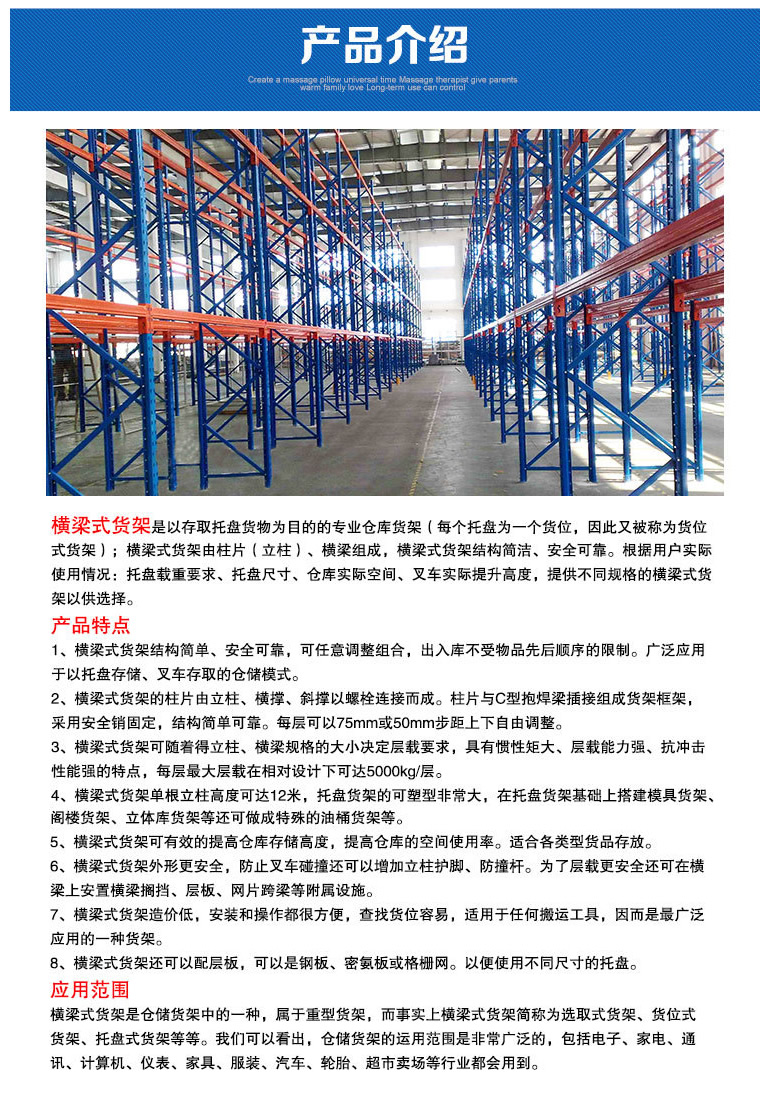 重型貨架主要特征 ■通常貨物通過托盤、倉儲籠等單元集裝設備整裝后存入貨架保管。每單元載重一般在2000kg以內,每層通常放兩個單元。 ■是較普遍和廣泛使用的貨架之一,適合絕大多數倉庫或產品貨物使用。 ■具有100%的貨物任意揀選特性。搬運機械如叉車等可到達任意貨位進行存儲作業,存儲作業方便、快捷! ■以機械搬運設備進行存儲作業。 ■單元貨架跨度一般在4m以內,深度在1.5m以內,低、高位倉庫貨架高度一般在12m以內,超高位倉庫貨架高度一般在30m以內(此類倉庫基本均為自動化倉庫,貨架總高由若干段12m以內立柱構成)。 ■能夠以75mm的整數倍自由調節每層層高。 重型(橫梁式)貨架一般采用冷軋異型鋼制作,立柱由80(90)x60(70)Ω型鋼表面沖菱形孔而成,橫梁由80x50-100x50-120x50-140x50-160x50抱焊梁連接掛件而成,一般用托盤代替層板方便叉車搬運。層載重1噸到5噸的設計,表面靜電噴塑,防水防銹防腐蝕能力更強,安全系數高,插接式組合,不需要用螺絲和焊接,組裝非常方便,充分利用空間面積,提供倉儲能力。
